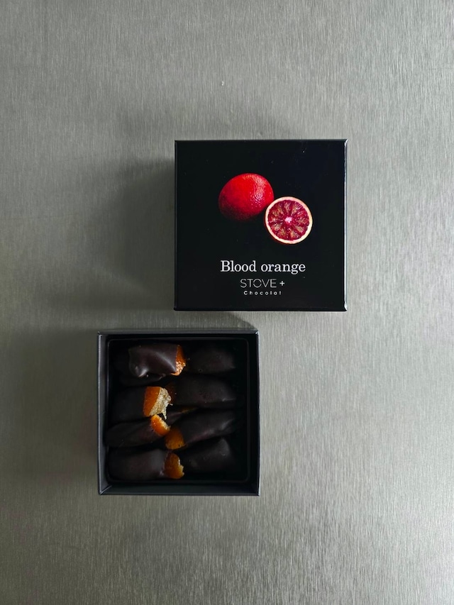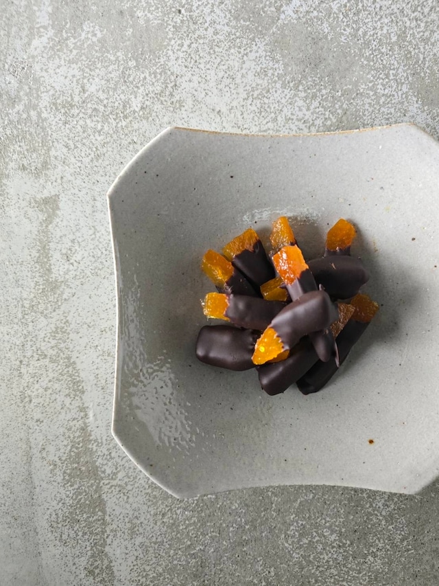 国産ブラッドオレンジの皮を煮込み、ゆっくりと糖化させた自家製コンフィにショコラノワールを合わせました。