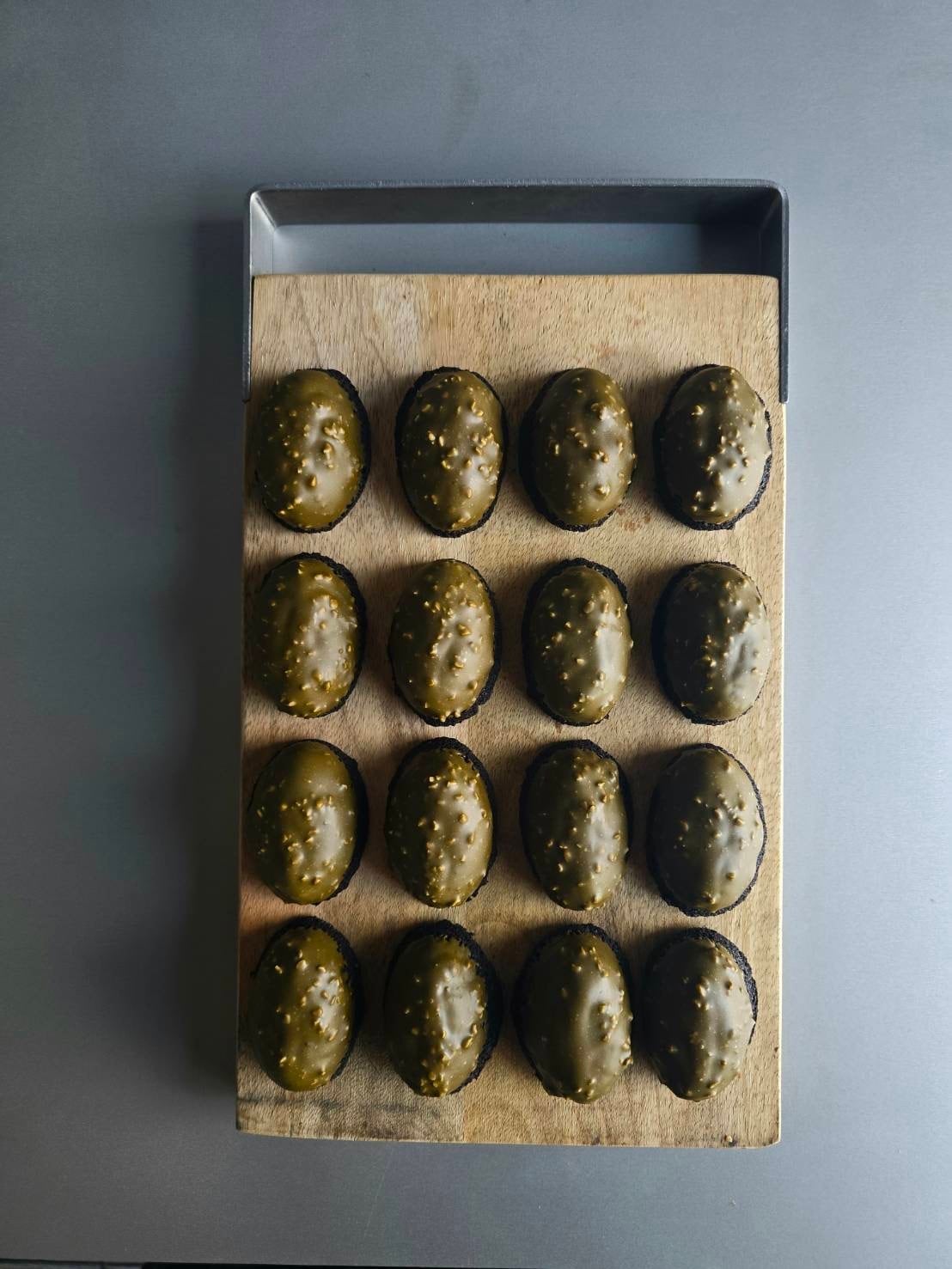 カカオパウダーとシュコラノワールを練り込んだ発酵バターたっぷりのしっとりとした生地にラム酒でアクセントをつけて焼き上げ、焙煎ほうじ茶のショコラでトランペ致しました。