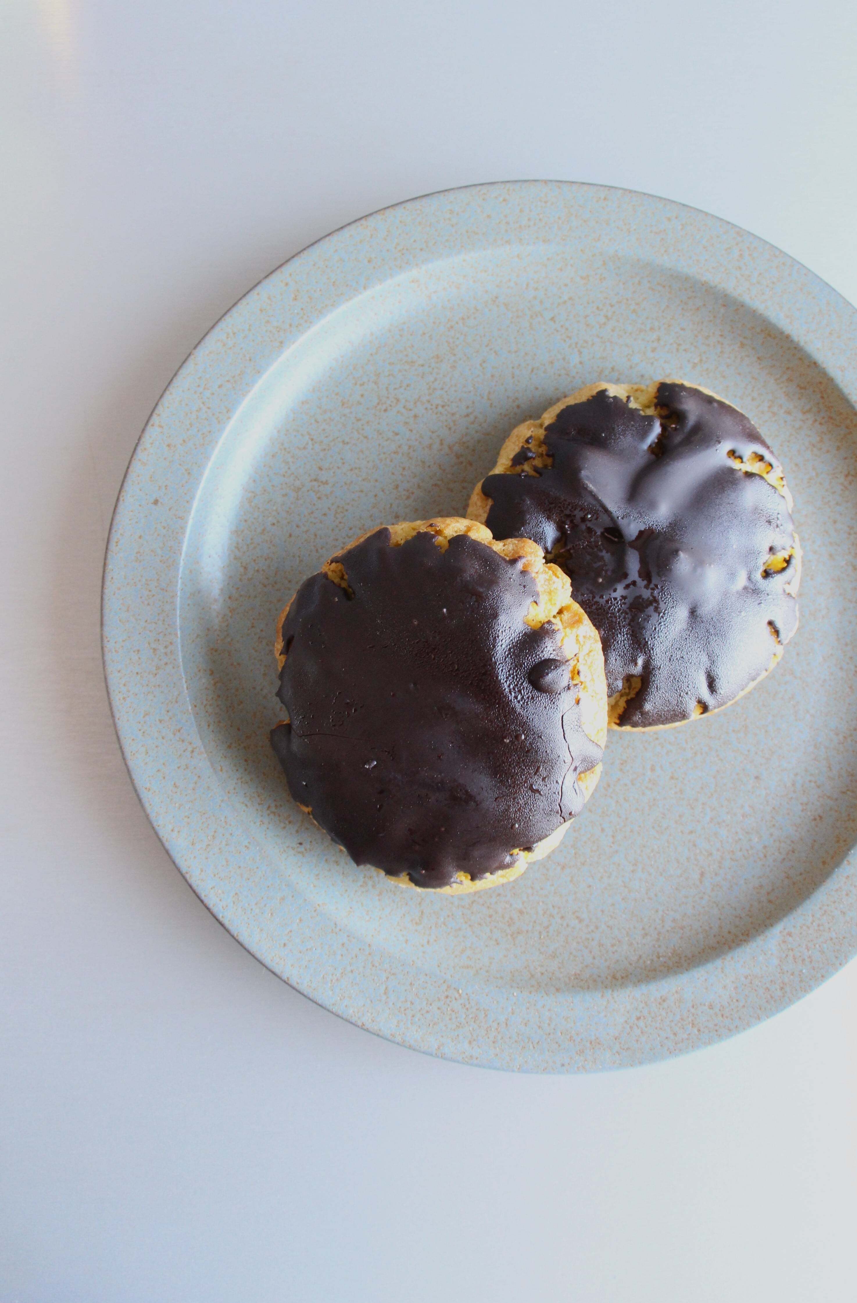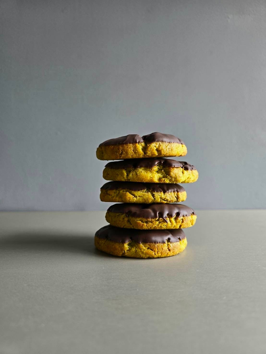 焼成後にはチョコレートで表面を覆いパリンとした食感をプラスしたサクサク、プチプチとしたクッキー本体との対比が美味しい厚焼きクッキーです。